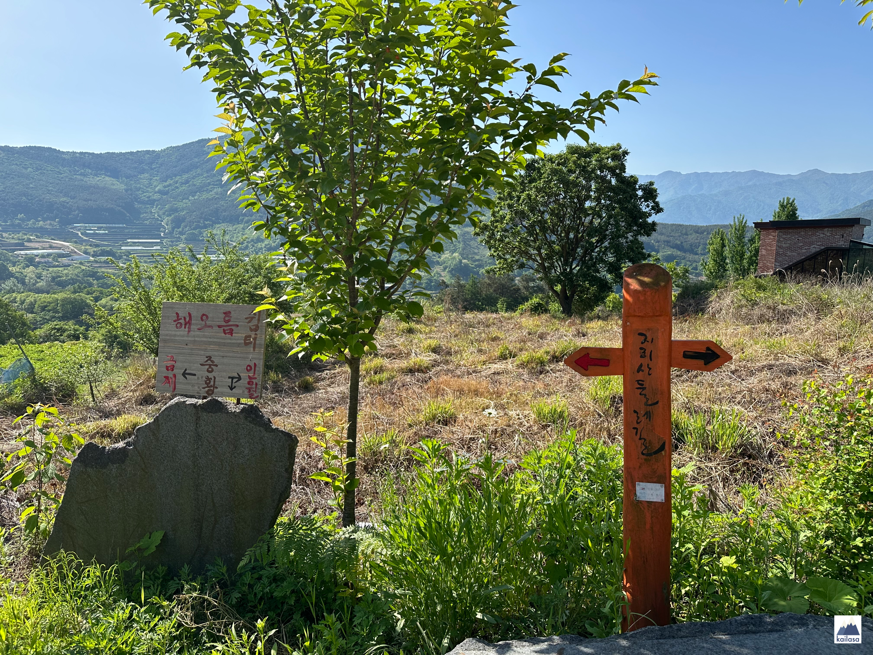 전 날 숙소 들어오면서 집 근처가 둘레길이나 다름없겠다는 이야기를 했는데 숙소 바로 앞에 지리산 둘레길 이정표(벅수)가 있다. 우리가 묵은 곳이 지리산 둘레길 3코스 - 인월에서 금계 가는 길, 중황마을 해오름 쉼터였나보다. 아무 것도 모르고 그냥 예약해서 묵었는데 진짜 둘레길이었어! ㅋㅋㅋ