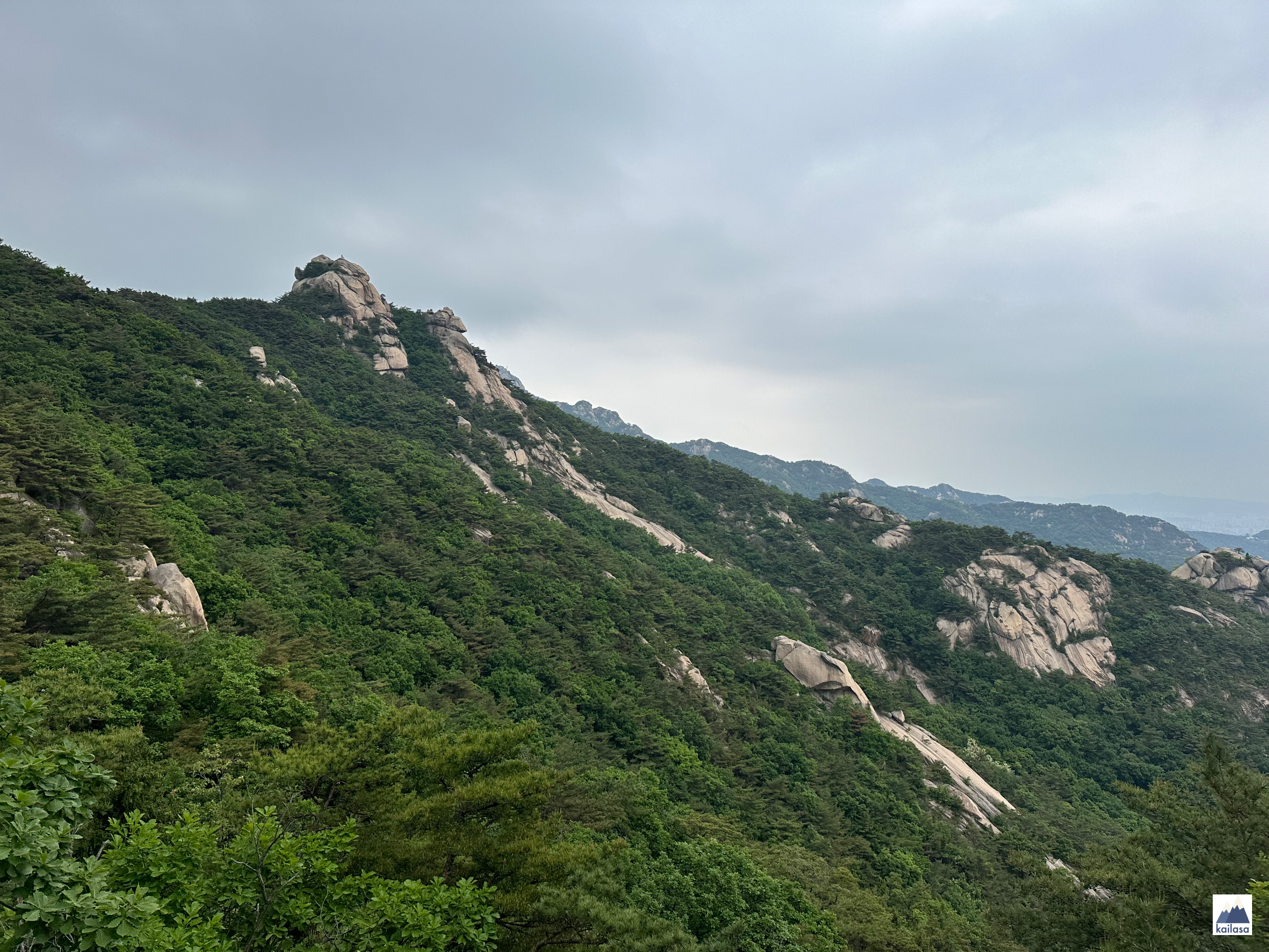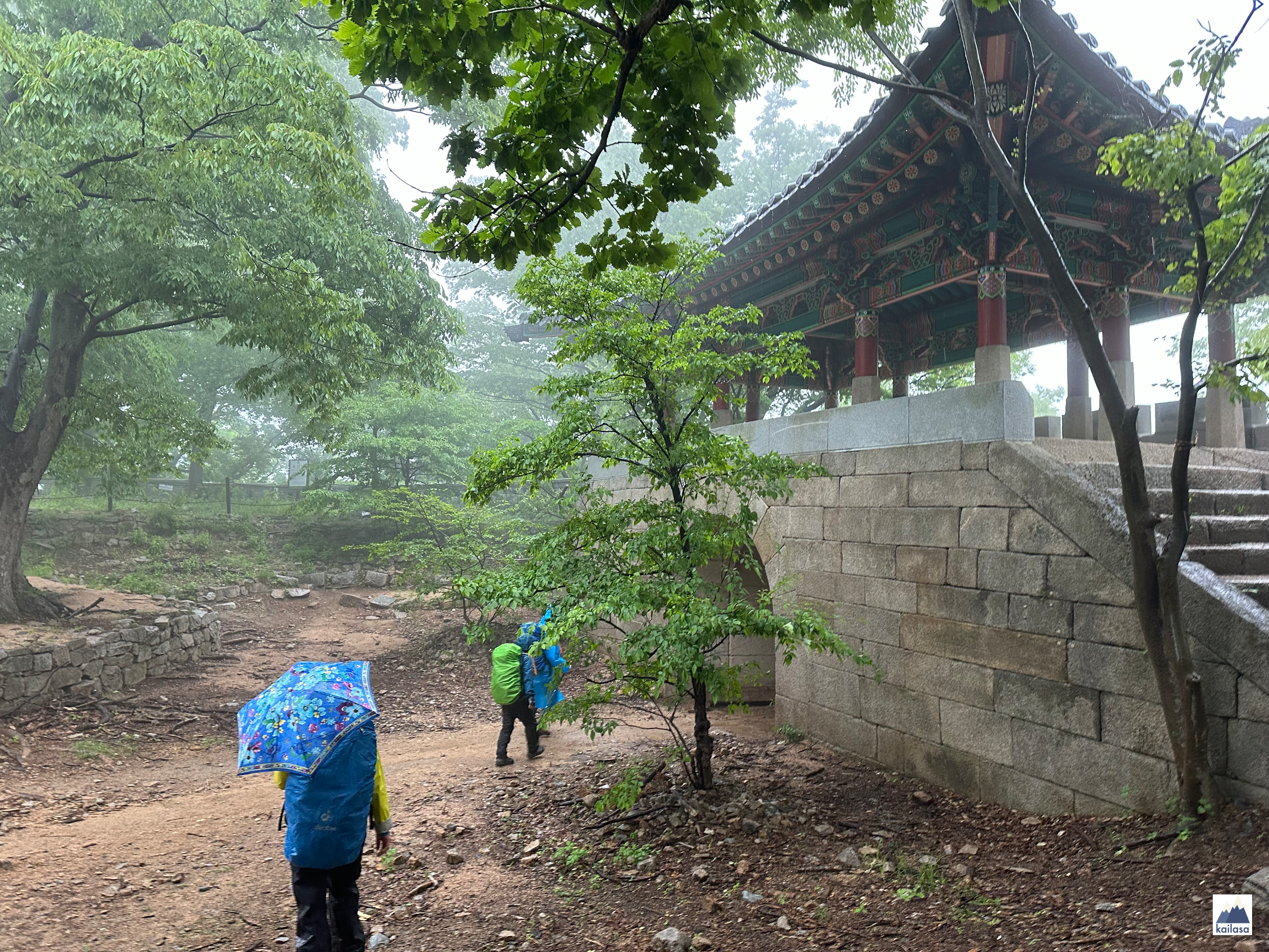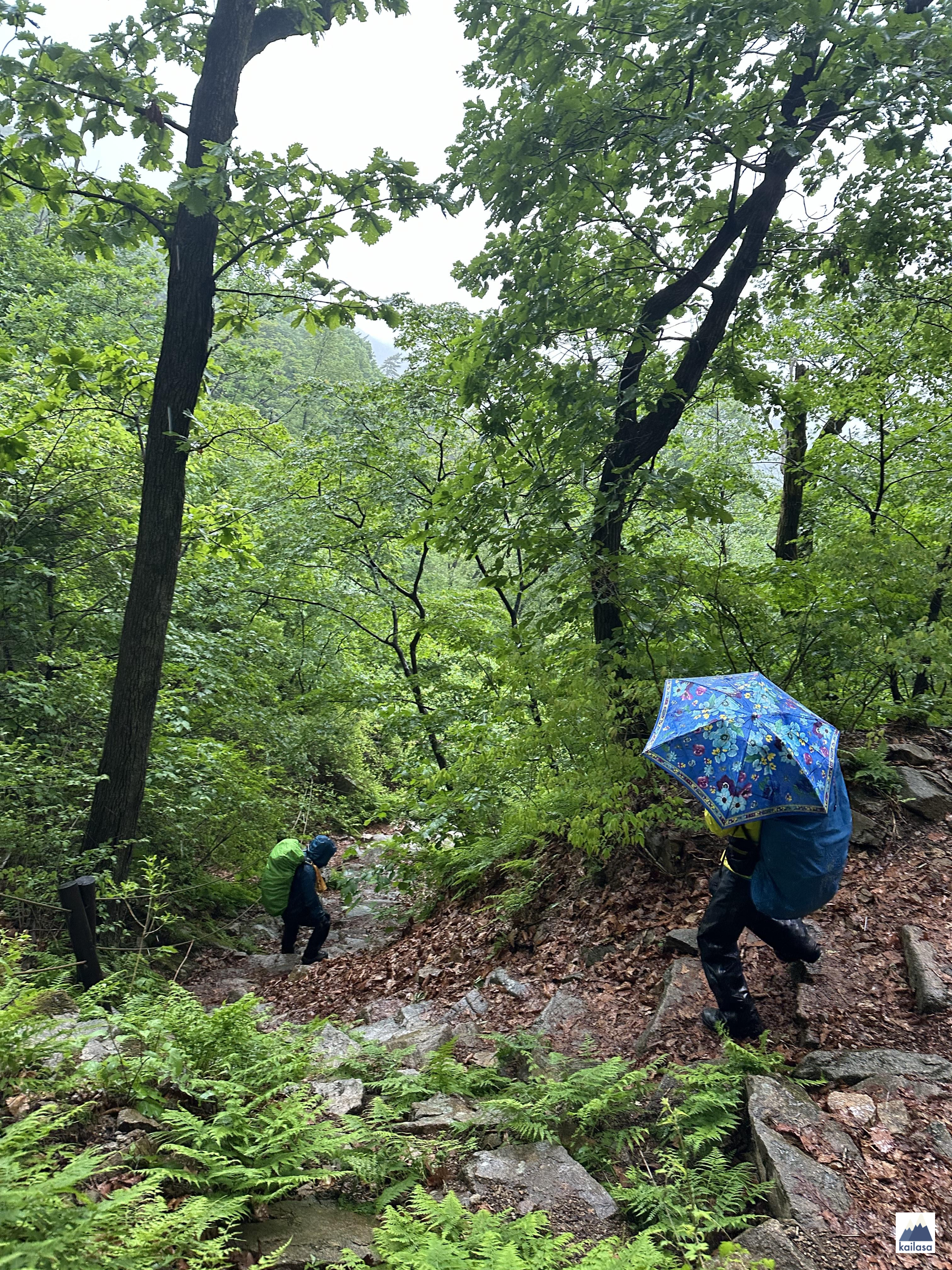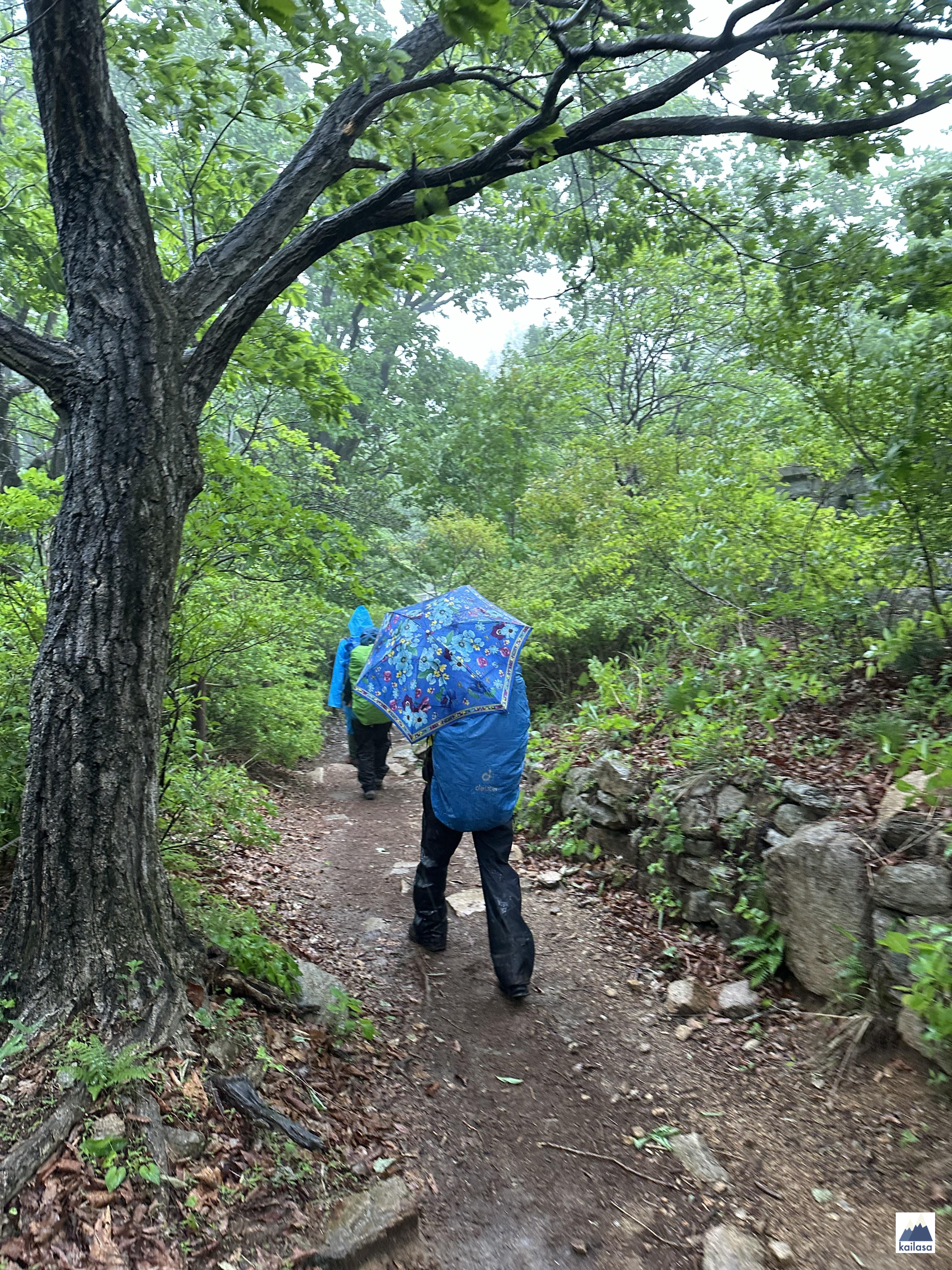 1시쯤부터 빗방울이 떨어졌다. 제대로 된 우비랑 바람막이 바지를 네팔에 두고 왔는데 그건 그렇다 치더라도 다이소에서 파는 우비도 있었고 쟈켓처럼 입는 우비도 있었는데 비 올 줄 알았으면서 왜 챙겨올 생각을 안했을까? 비가 와서 원래 가기로 했던 비봉은 패스하고 쭉쭉 내려가기로 했다.