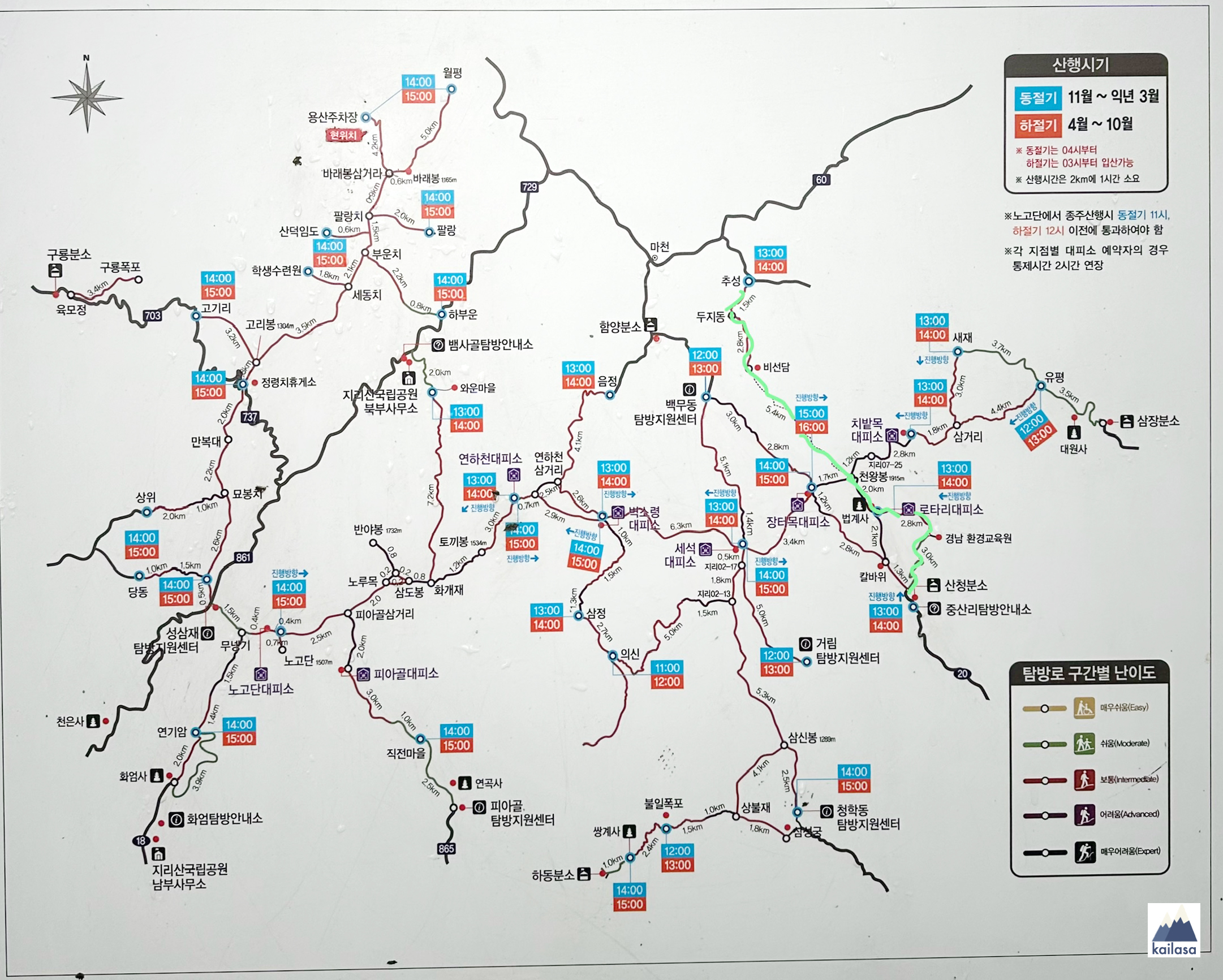 코스 추성주차장 - 비선담 - 상원교 - 칠선폭포 - 대륙폭포 - 삼층폭포 - 마폭포 - 천왕봉 - 법계사 - 로타리대피소 - 순두류 - 중산리탐방지원센터