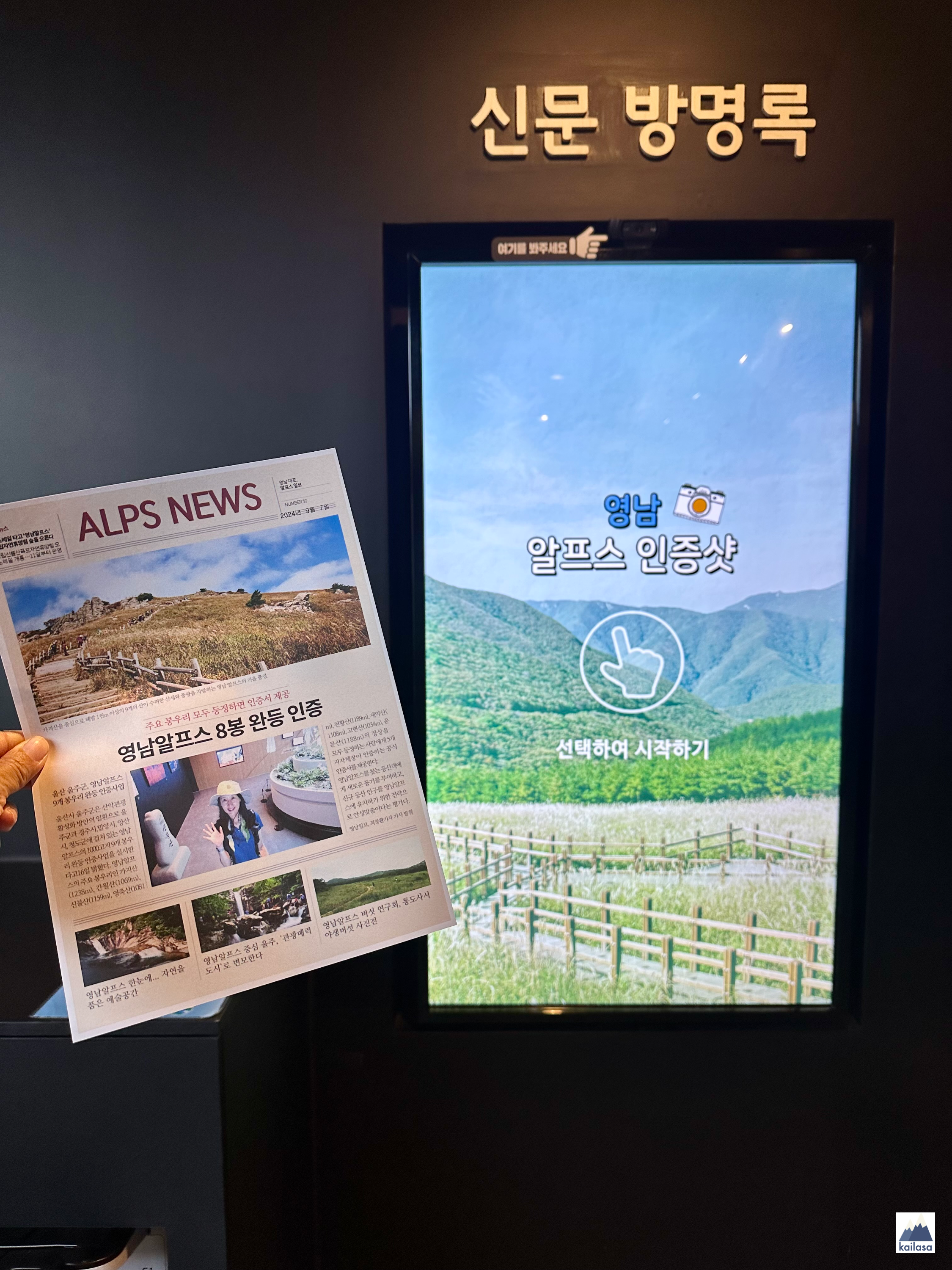 사진을 찍고 템플릿을 선택하면 영남알프스 8봉 완등 신문을 출력하거나 메일로 보낼 수 있다. (완등 안했지만 기념으로 프린트해서 가져왔다 ㅎ)