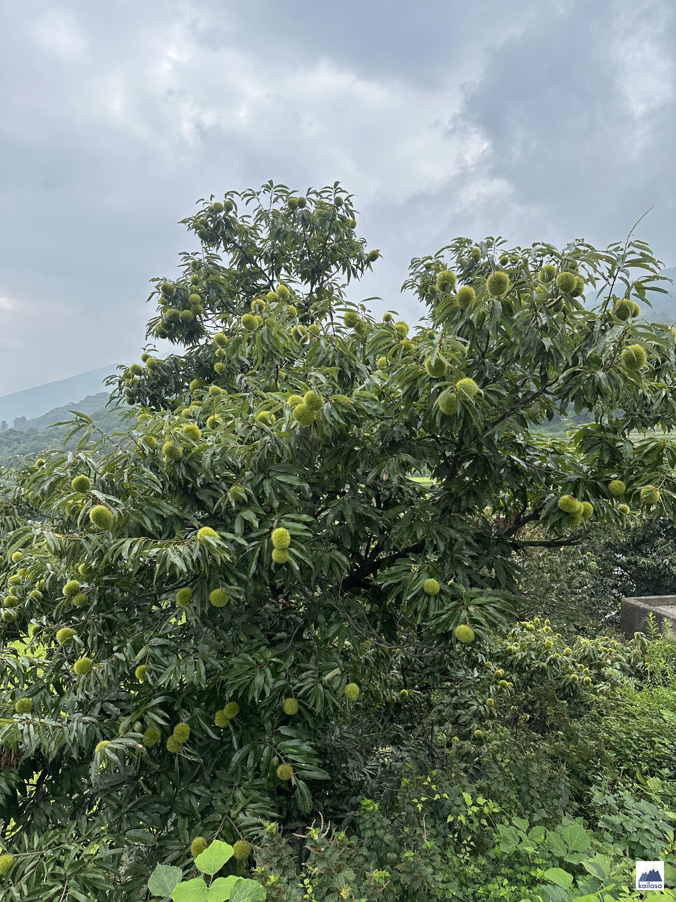 녹색 야구공이 매달린 것처럼 보이는 밤나무. 밤이 주렁주렁 열렸다.