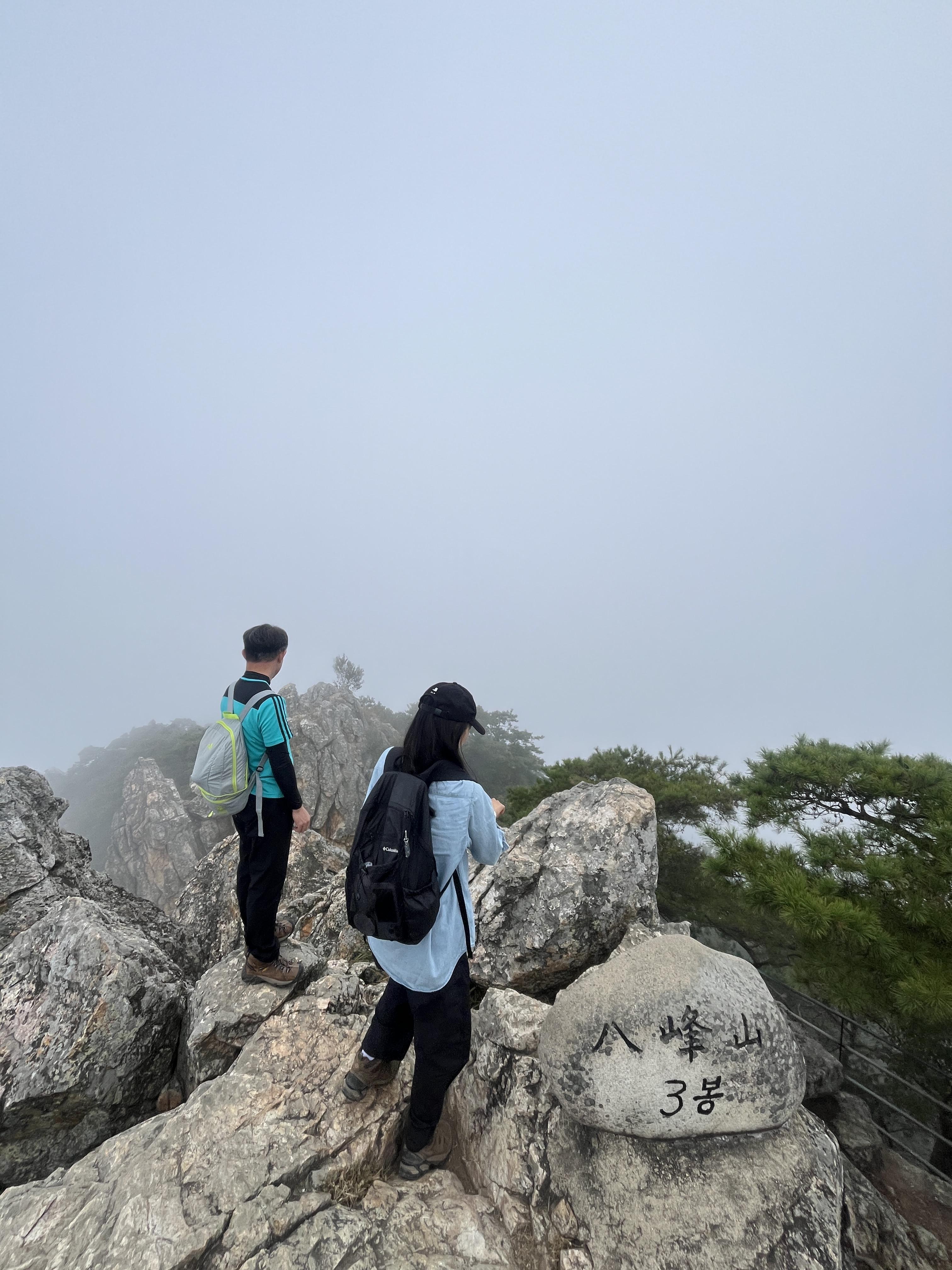 초반에는 사방이 하얘서 보이는 게 없었다. 그런데 팔봉산 정상석 너무 귀엽다. 쪼꼬미 정상석에 봉우리와 봉우리 사이도 가까워서 어떤 봉우리는 2-3분이면 간다 ㅋㅋ