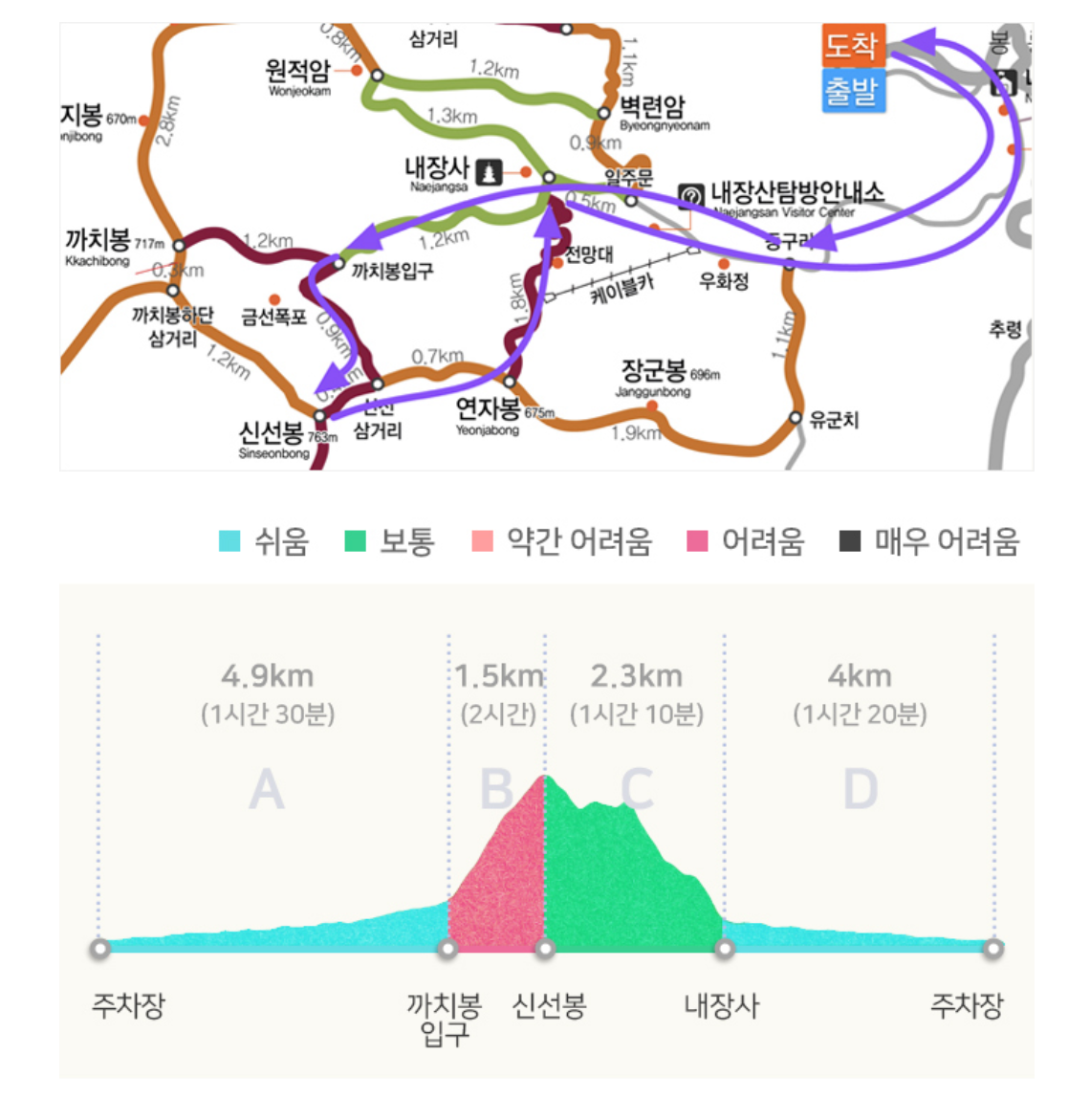 코스 주차장 - 일주문 - 내장사 - 원적암 - 벽력암 - 일주문 - 주차장