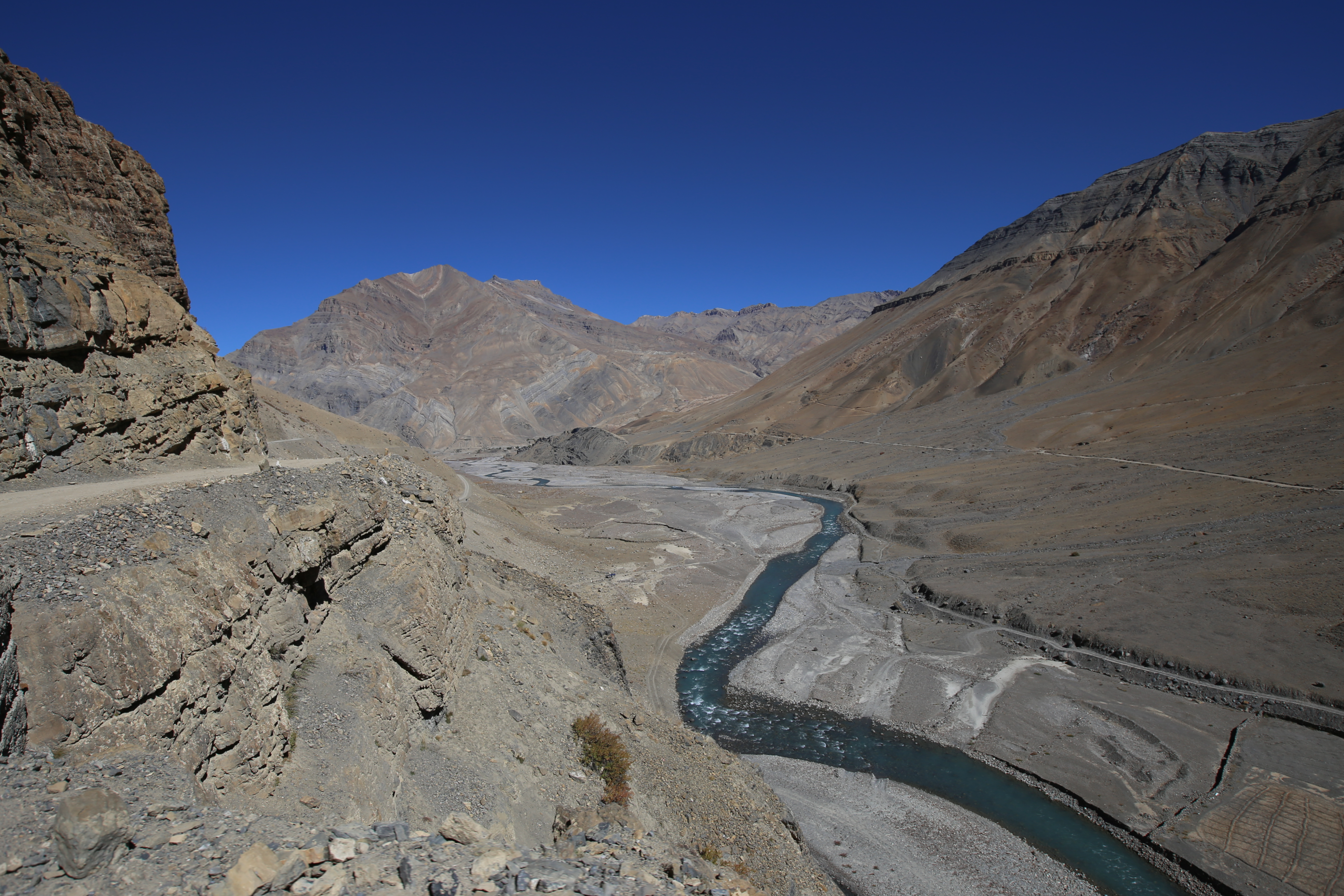 꼬부랑 길을 한참 내려간 뒤 협곡 사이를 달렸다. 어제 단카르 오는 길도 참 멋지다고 생각했지만 오늘 가는 길은 보는 곳마다 우와! 소리가 절로 나온다. 지층이 어떻게 쌓였는지 고스란히 보이는 지형. L은 책을 구부려놓은 것 같다고, 지구의 속살을 보는 것 같다고 했다. 돌들의 향연. K는 바위의 바다라 했다.