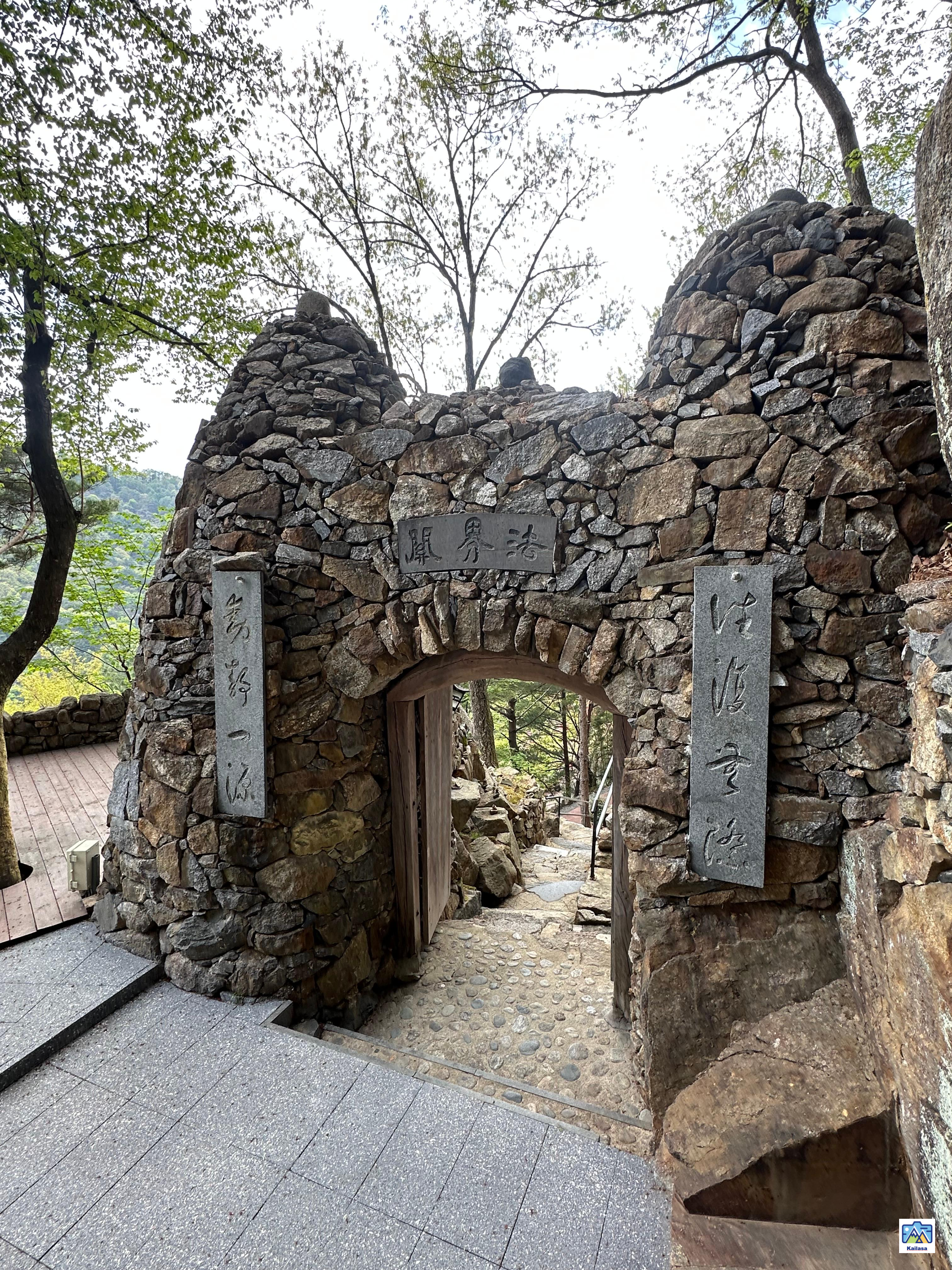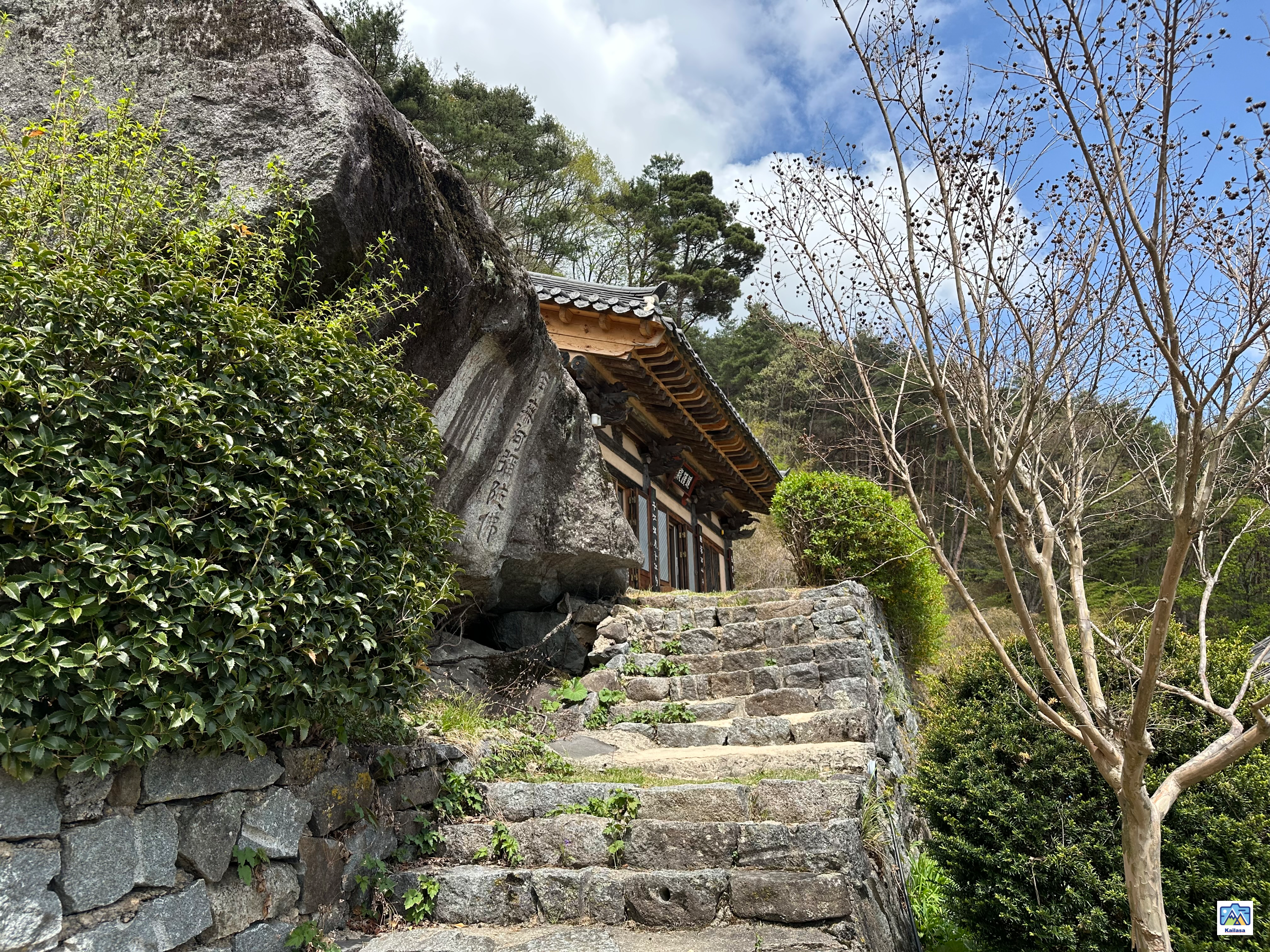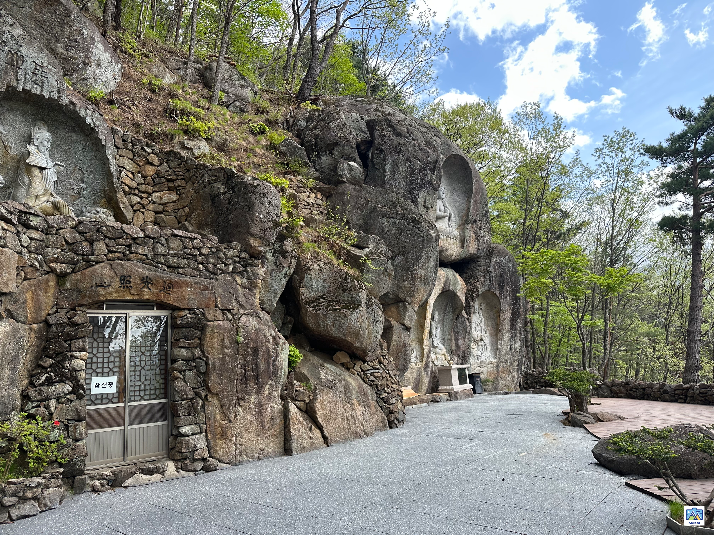 석굴 법당인 '극락전' (극락전 내부는 촬영할 수 없다.) 주위에 바위를 이용하여 사천왕문, 비로전, 산신각 등 다양한 내용이 새겨져 있다.