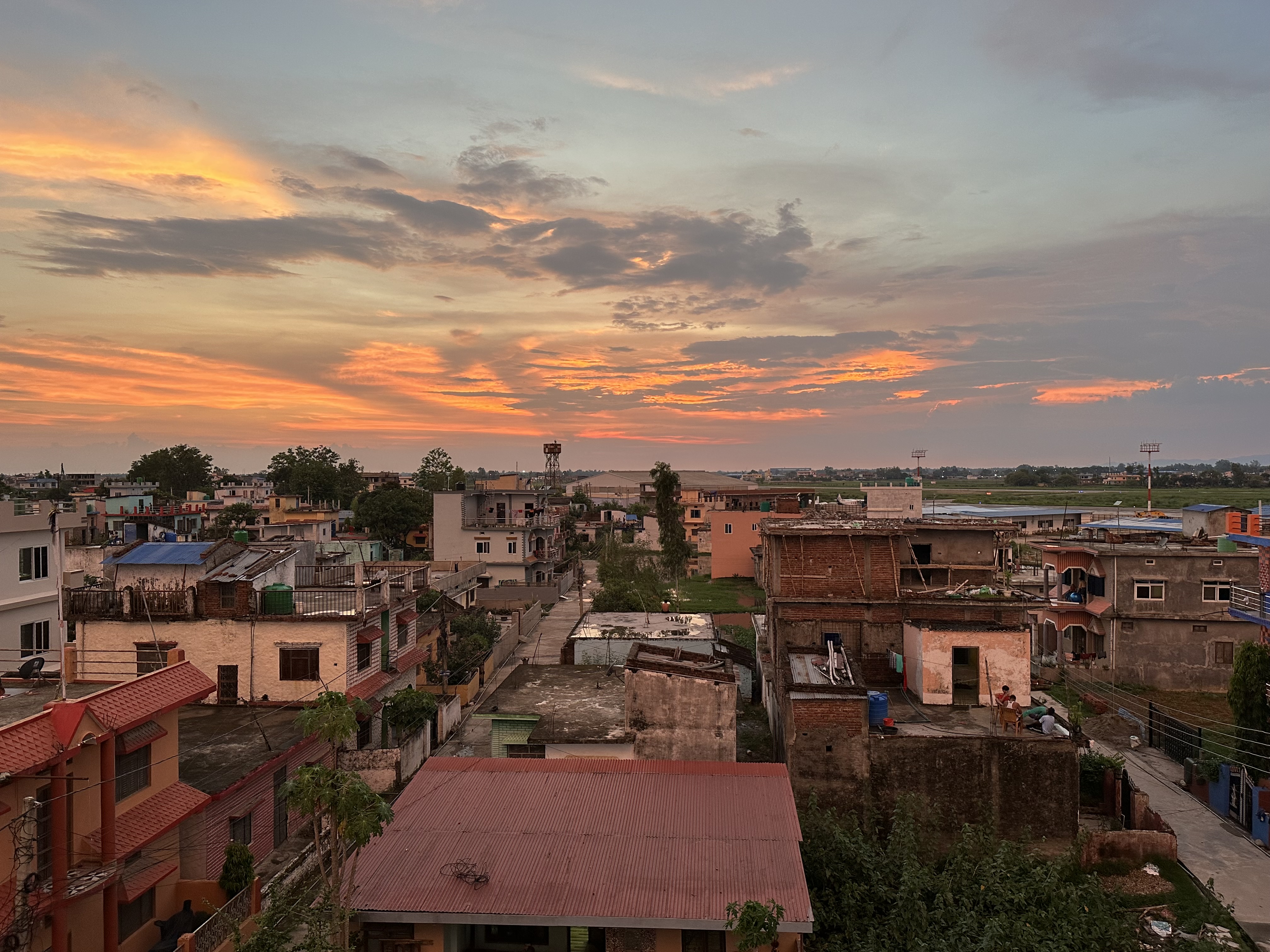 창밖으로 보이는 마을과 집, 뛰어다니는 아이들, 더위 피해 옥상에 올라와있는 사람들.