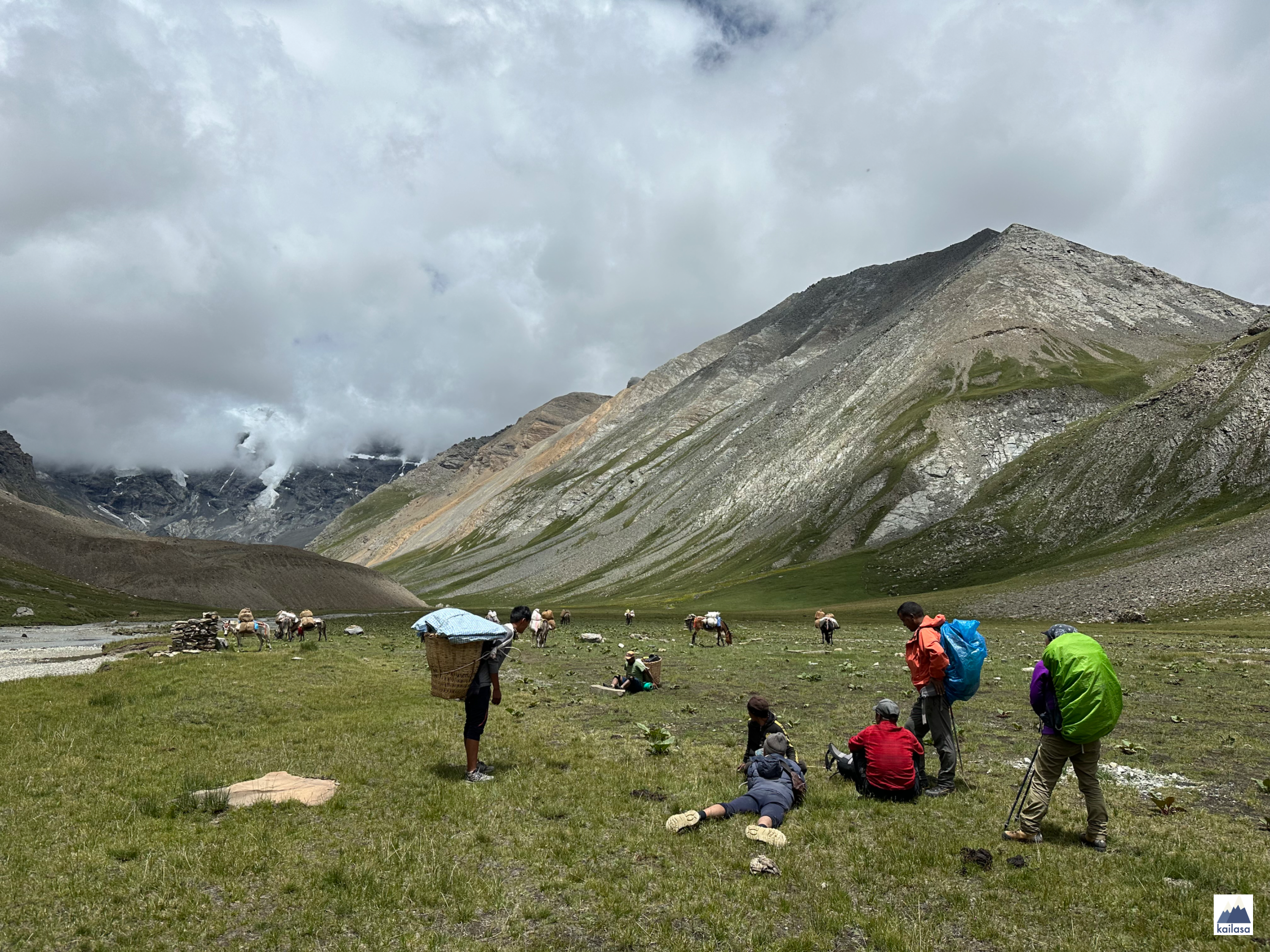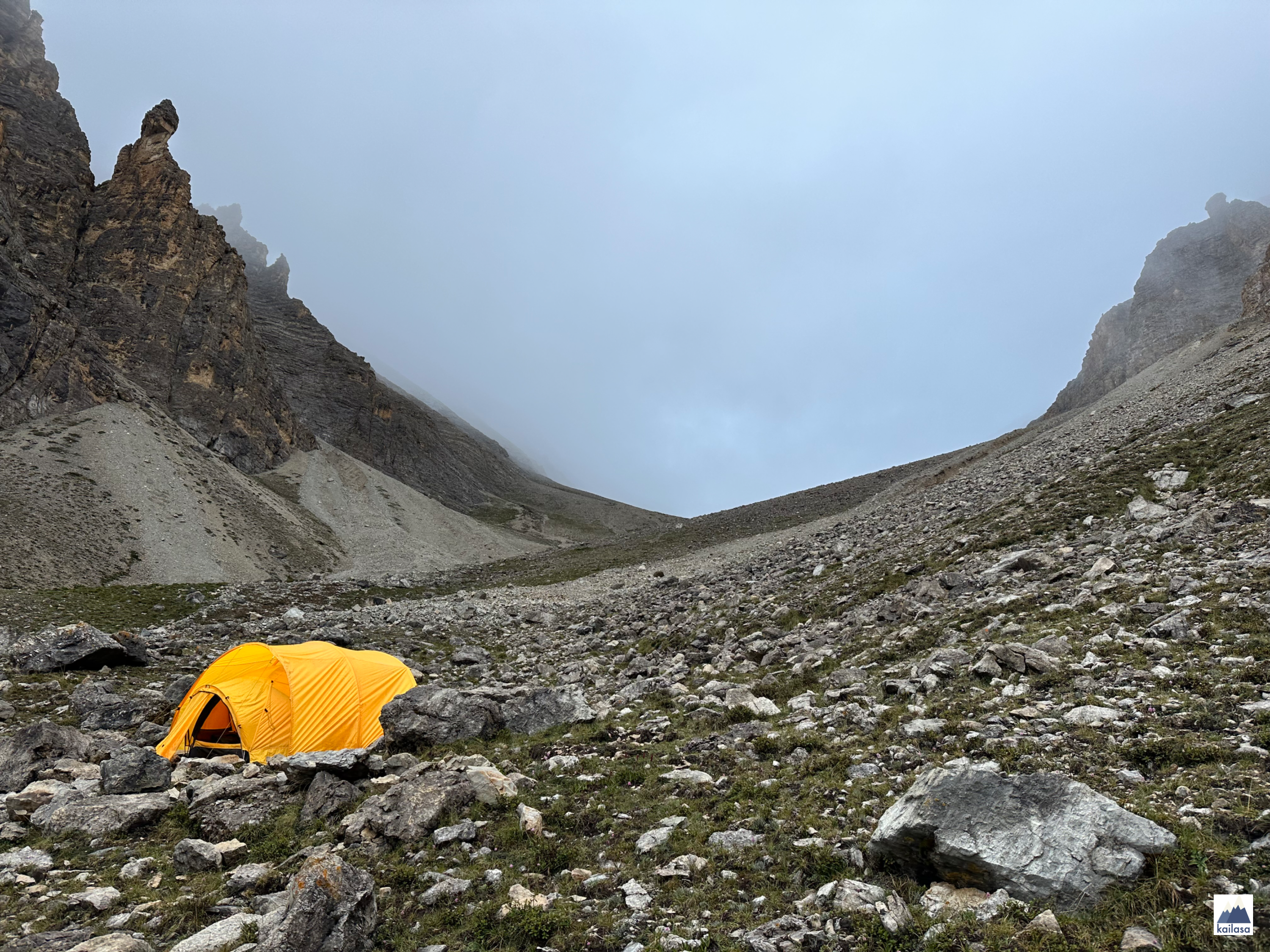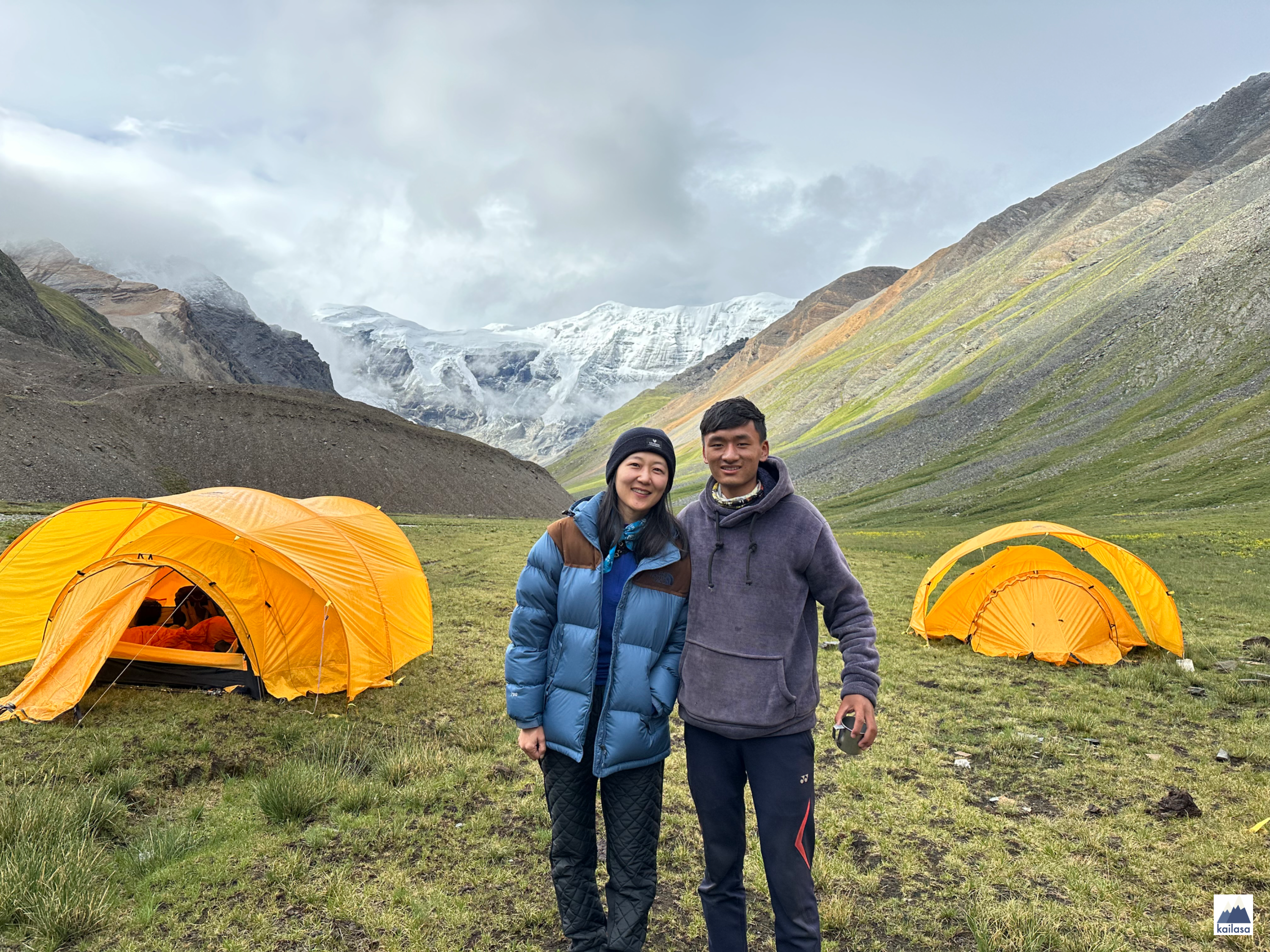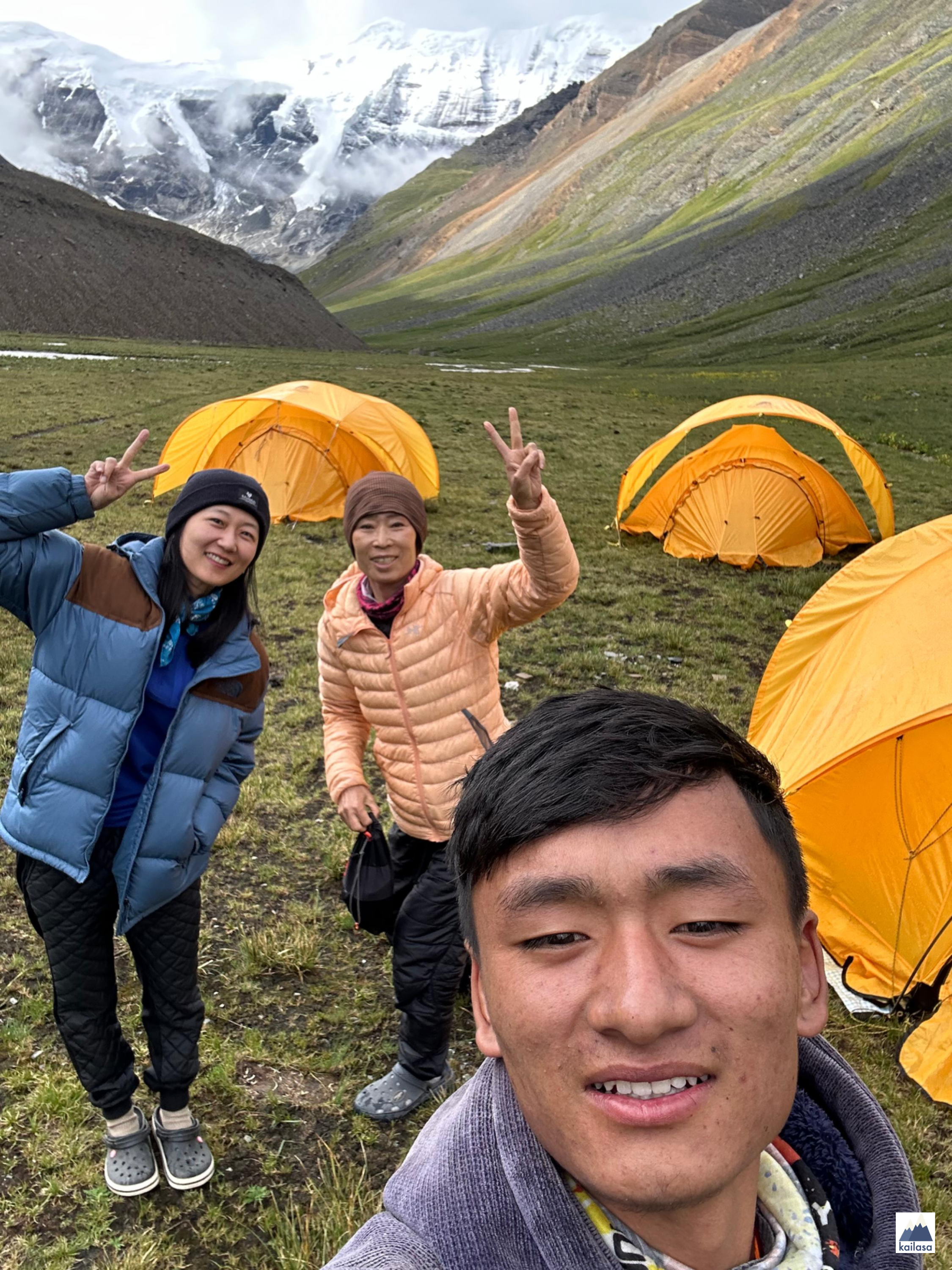 아름다운 풍경 속을 걷다 어느덧 캠프 사이트에 도착했다. 뒤로 설산이 보이는 아름다운 곳이다. 풍경을 더 즐기고 싶었는데 텐트 치기가 무섭게 비가 온다;