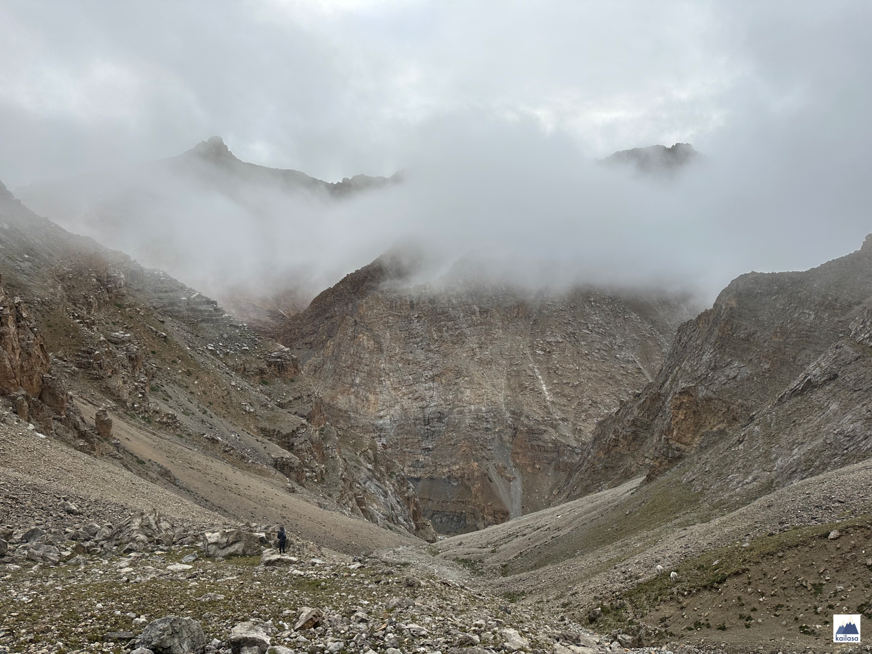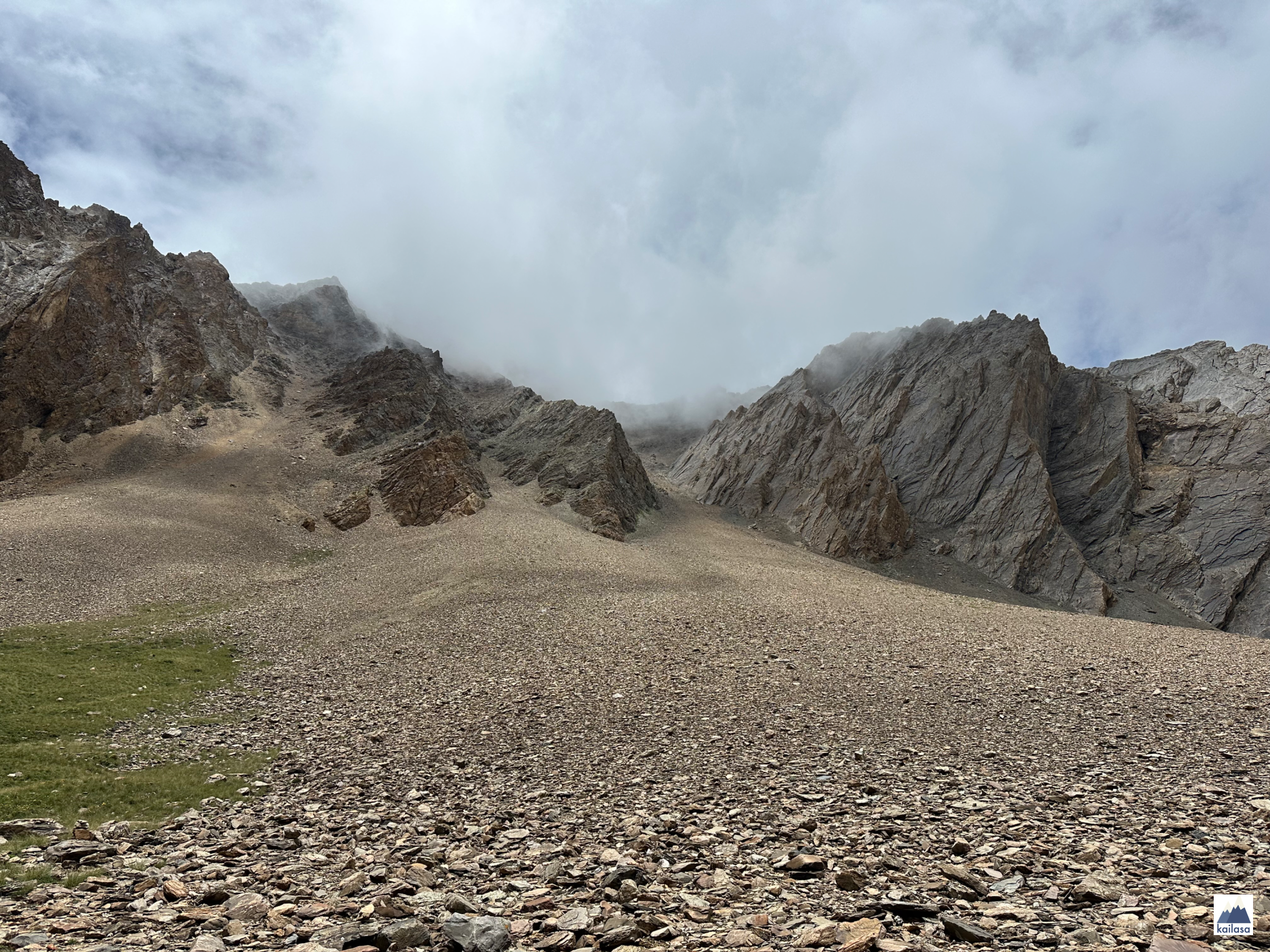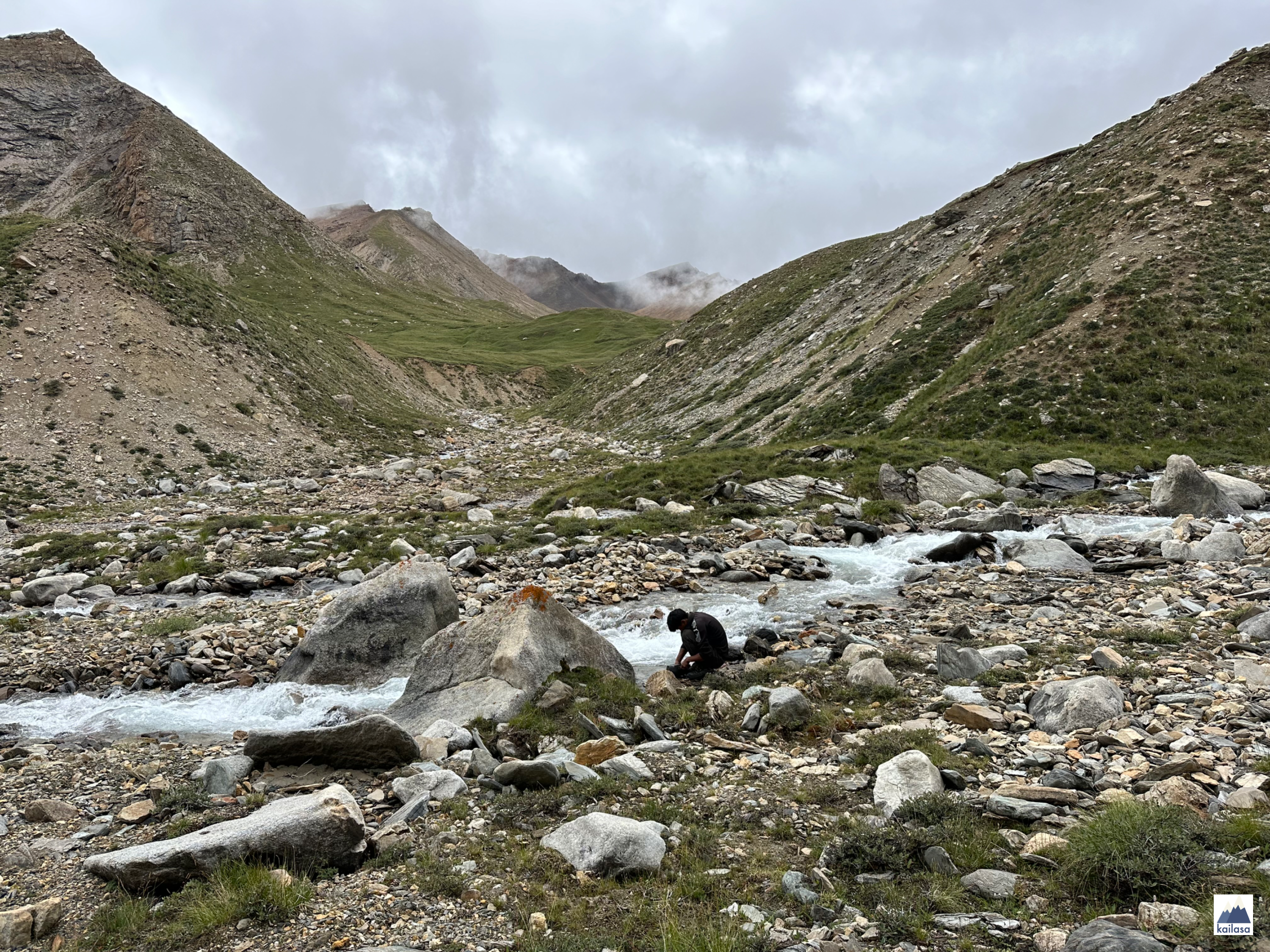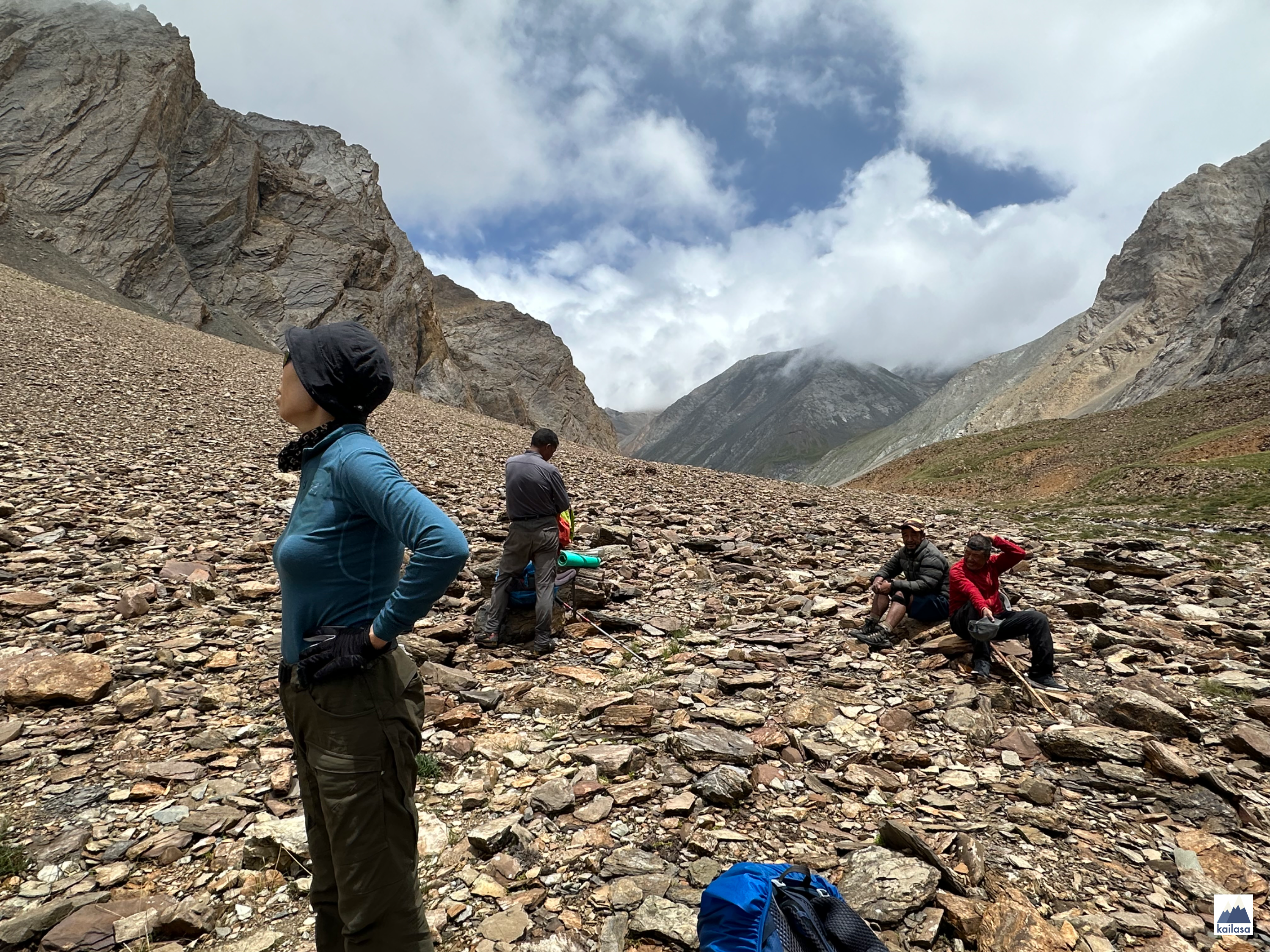 삭막한 캠프 사이트에서 아침으로 북엇국과 계란말이를 먹고 린지를 따라 내리막길을 내려갔다. 아래 보이는 계곡에서 돌았으면 좋겠다. 그 앞의 깎아지르는 산을 넘는 일은 하지 않겠지?