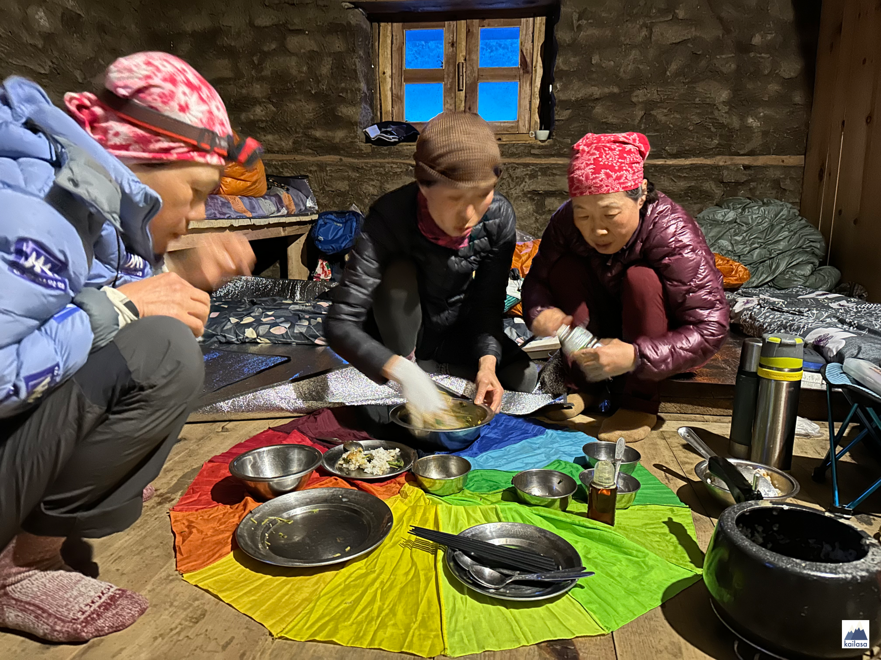 저녁은 2층에서 우리가 비빔밥을 해 먹었다. 현지 조달 공수된 비릅나물을 린지가 데쳐주었고, 참기름, 들기름 넣고 원숙 언니가 손으로 싹싹 비비셔서 만드셨다. 히말라야 유기농 산나물! 이제까지 밥 다 맛있었지만 이건 정말 맛있었다!! 어디에서도 먹을 수 없는 히말라야 산채나물비빔밥!! 너무 맛있어서 밥 한솥을 뚝딱 먹었다. (린지가 누룽지 끓일 밥도 안 남았다고 ㅋㅋ)