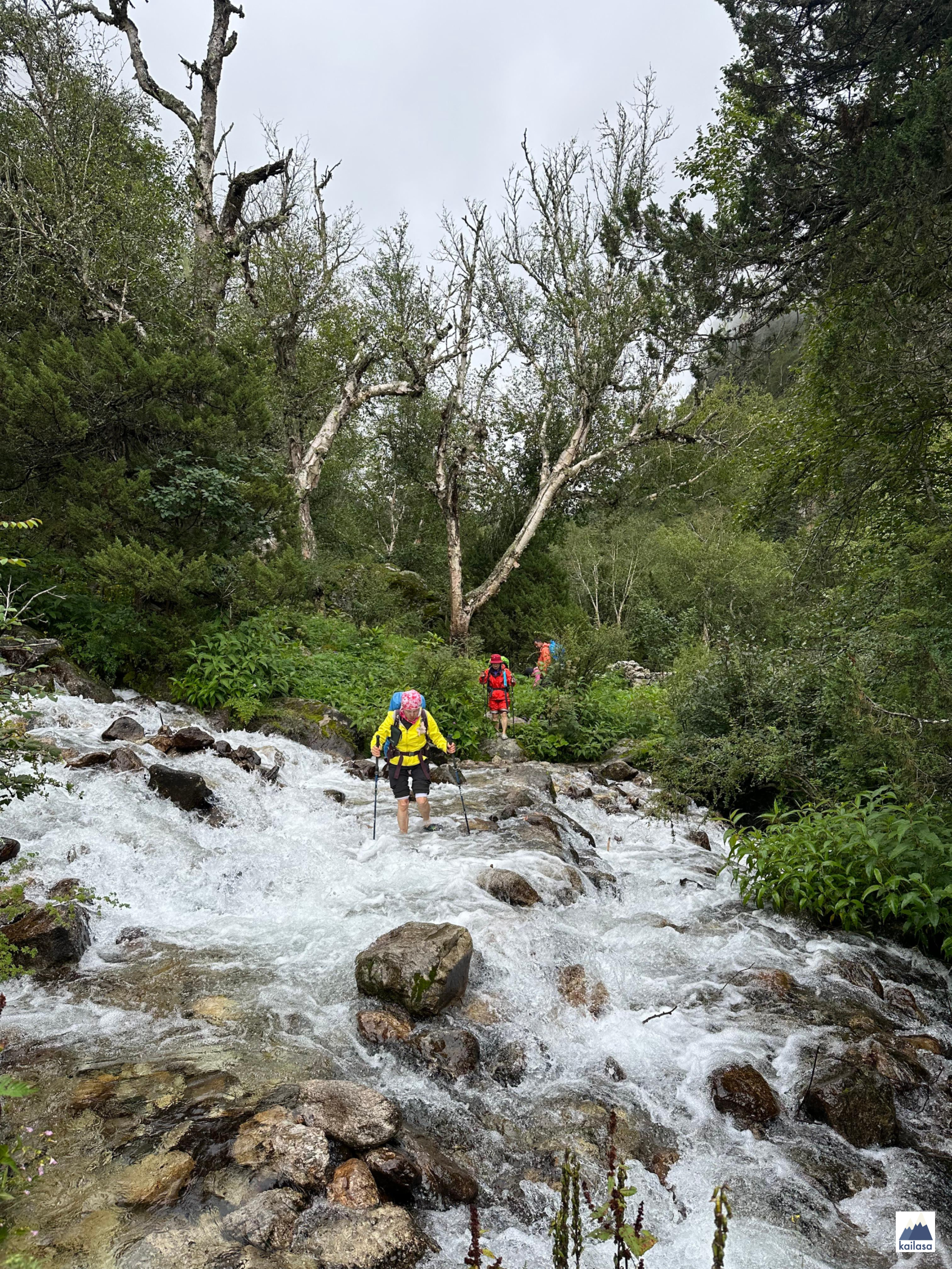 풀숲을 지나 통나무 다리를 건넜다. 이번에도 말이 문제다. 이 다리를 말이 안전하게 건널 수 있도록 나뭇가지, 이끼, 풀, 돌 등을 잔뜩 가져다 실었다. 좀 더 평탄하게 하기 위한 보수 공사랄까. 말들이 오기까지 한참 기다리다 무사히 건너는 것을 보고 우리도 출발했다.