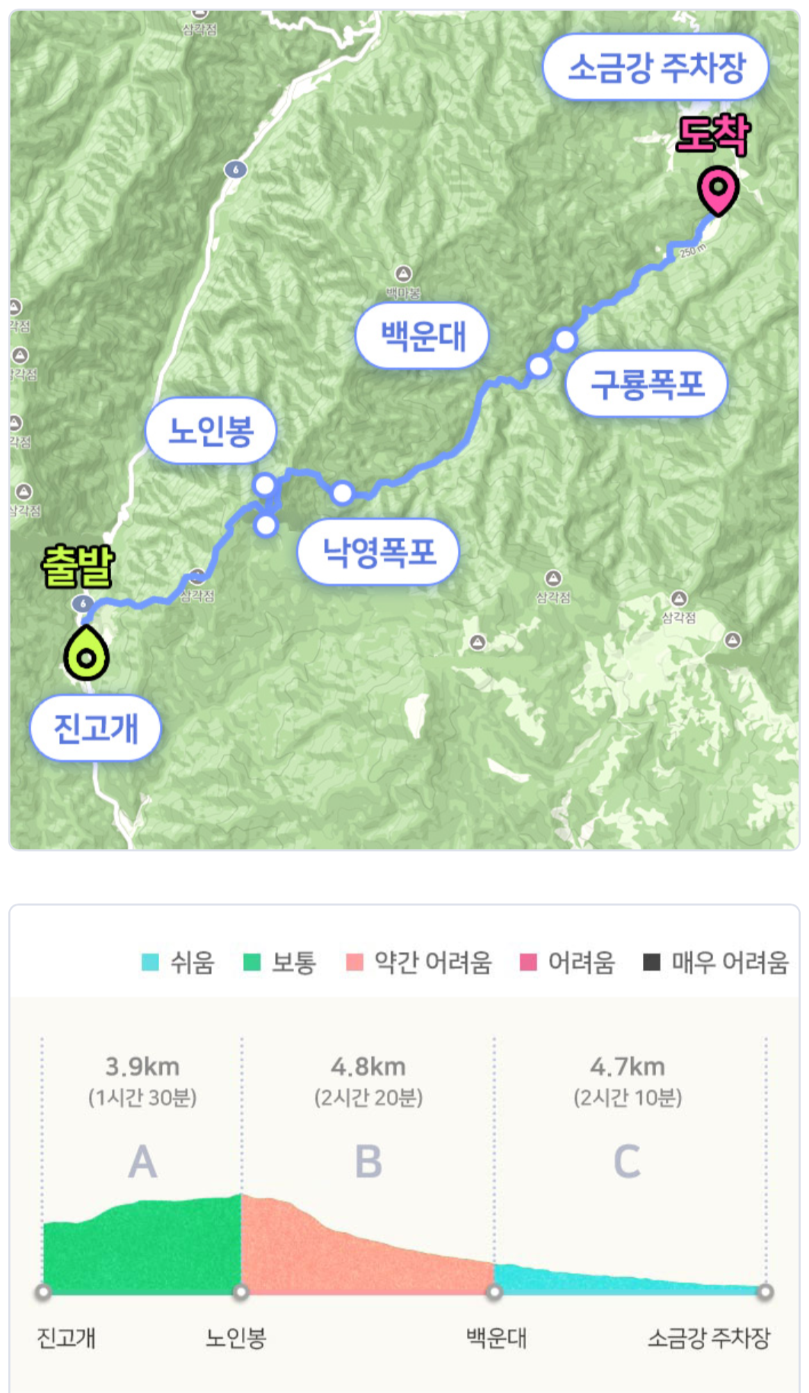 코스 진고개휴게소 - 노인봉 - 백운대 - 소금강주차장