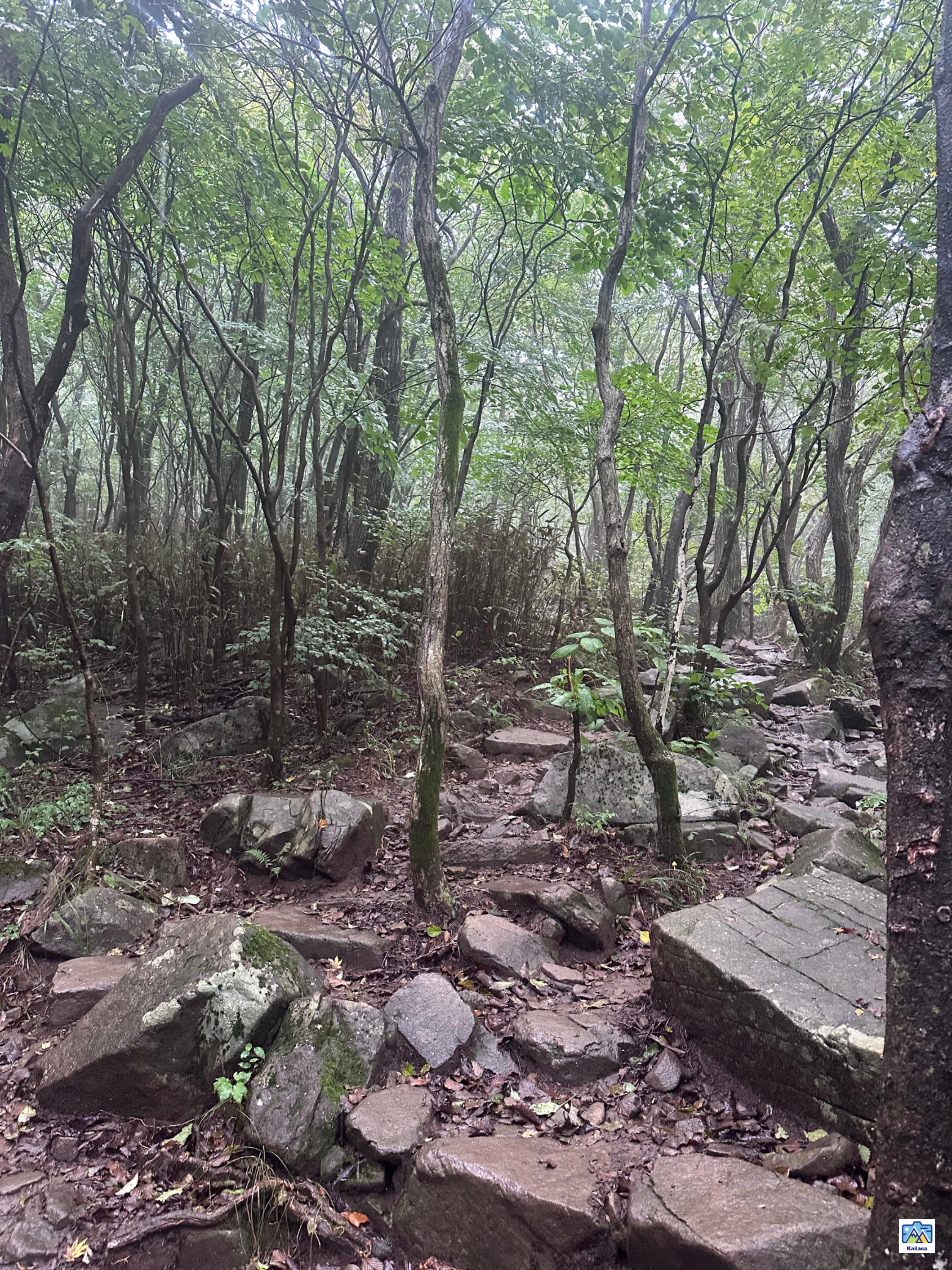 무등산옛길은 완만하니 오르기 쉽다. 그런데.. 비가 내린다. 일기예보에서 그친다던 비가 더 세차게 내렸다. 버텨보았지만 빗줄기가 굵어지기에 집어넣은 우비를 다시 꺼내 입어야했다. 앞서 가든 분들 모두 우비 내지는 우산을 꺼내들고 물 웅덩이를 지나갔다.