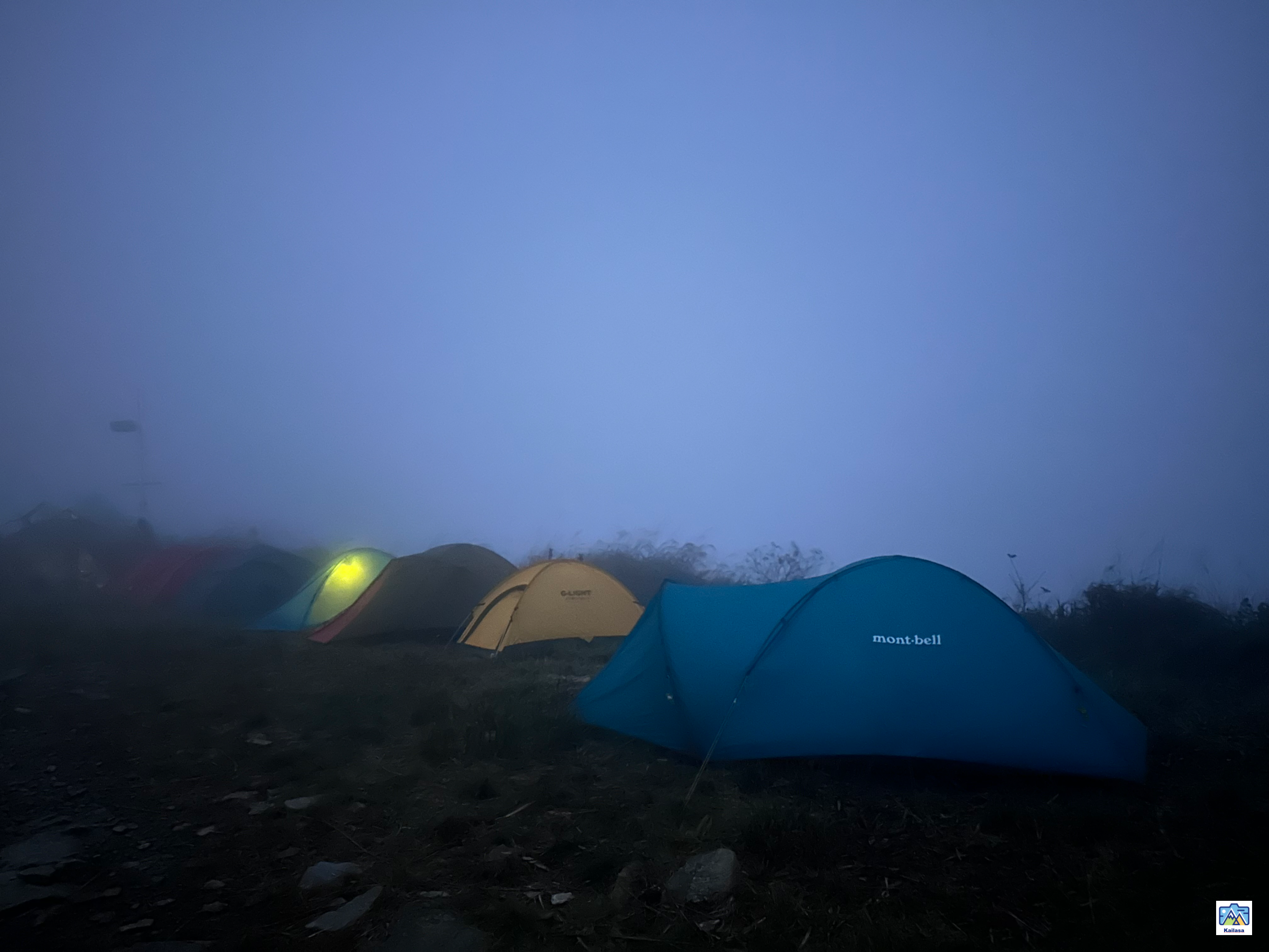 그냥 다음에 다시 올 생각으로 마음 편하게 먹고 걷다 보니 연대봉에 도착했다. 연대봉 주위에는 비박하시는 분들이 많았다. 텐트가 주르륵.